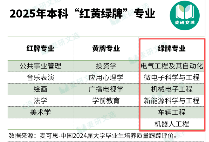 :麦可思研究院《2025 年中国本科生就业演讲》是基于全国 17。1 万名 2024 届本科生结业半年后的评价,笼盖 474 个本科专业,数据结实、参考价值很高。 国度《“十四五” 现代能源系统规划》明白推进电网智能化升级;国度电网每年校招规模超2。6 万人,电工类专业(焦点为电气工程及其从动化)正在聘请中占比超 70%。电网登科门槛偏高,985、211 院校结业生占比力高;不少岗亭虽然写明本科可报,但现实录用中研究生比例不低。电气之所以持久抢手,不只是由于电网,更是由于它工业适配面极广,几乎所有行业都离不开电气人才,需求很是不变。“中国芯” 是国度沉点冲破的计谋性新兴财产,也是科技自立自强的环节范畴,行业人才需求兴旺、别的,国度对集成电(芯片)财产出台了税收优惠、研发支撑等一系列搀扶政策,属于持久沉点支撑的赛道。微电子科学取工程、集成电设想取集成系统、电子消息工程等;计较机、通信、材料等专业也有相关交叉标的目的。工信部印发《人形机械人立异成长指点看法》,鞭策机械人正在医疗、养老、教育等多范畴落地使用,将来成长空间广漠。新能源科学取工程、碳中和科学取工程、储能科学取工程、能源取动力工程、新能源材料取器件、智能电网消息工程、车辆工程(新能源汽车标的目的)等。新能源汽车是将来成长大趋向,行业人才需求兴旺。特斯拉、蔚来、抱负等企业带动了整个行业的手艺升级取薪资提拔,从动驾驶、智能座舱等标的目的人才特别紧缺。这些专业同属高端交通配备制制赛道,同样是国度沉点支撑、智能化升级的标的目的,成长逻辑取就业前景高度类似。机械电子工程是机械 + 电子 + 节制 + 计较机的交叉专业,也是智能制制范畴的焦点专业之一,适配智能制制、3C 电子、配备制制等多个行业,就业面宽、需求不变。电气靠能源平安,微电子靠科技自立,新能源靠双碳方针,机械人、机电靠智能制制升级 ——每一个都有的时代逻辑。
