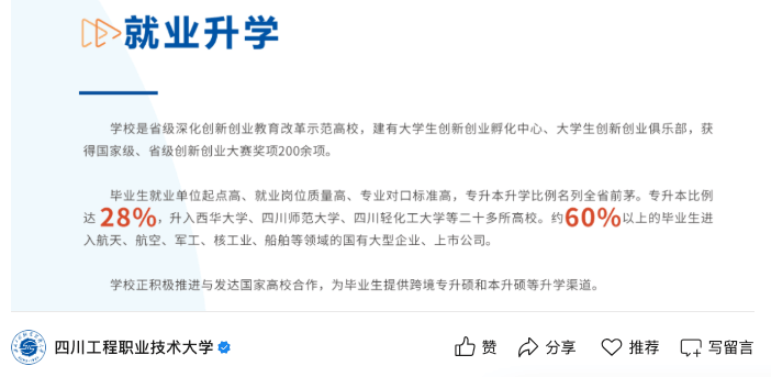 但从各方面环境来看,已然是一所很是不错的大学,学校的机械设想制制及从动化和飞翔器制制工程专业都是国度级一流本科专业扶植点。 山东智能制制工程手艺最低登科分为489,沉庆物理类电气工程及从动化最低登科分为503,贵州电气工程及从动化最低登科分为487。 沉庆科技大学位于,学校前身为开办于1951年的原地方部勉强属高校沉庆工业高档专科学校和沉庆石油高档专科学校,后历经多个成长阶段,正在2023年11月经教育部同意更为现名。 四川工程职业手艺大学亦是如斯,学校最新发布的就业数据显示,结业生有60%以上都能进入航空航天、军工、核工业。 所以家里有高中生的,家长必然要多领会一下高校专业方面的消息,以便正在高考竣事后可以或许协帮孩子报出一个较为抱负的意愿。